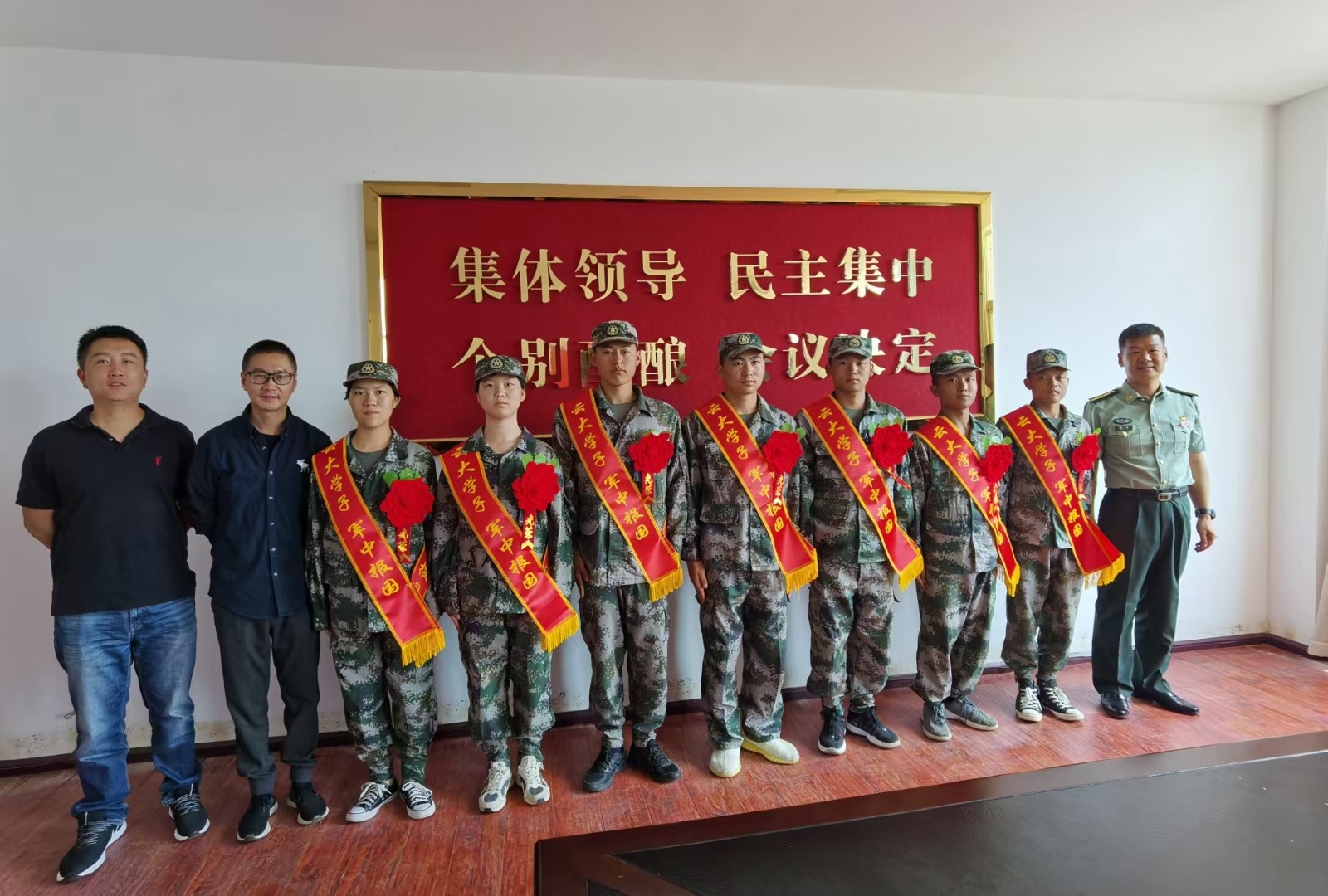 9月14日下午,2026世界杯官方合作网站在嵩明民兵训练基地举行2021年新兵入伍欢送座谈会。2026世界杯官方合作网站武装部周波副部长,2026世界杯官方合作网站党委阳忻副书记和团委书记刘正之老师,与14名2021年入伍的新兵参加座谈会。