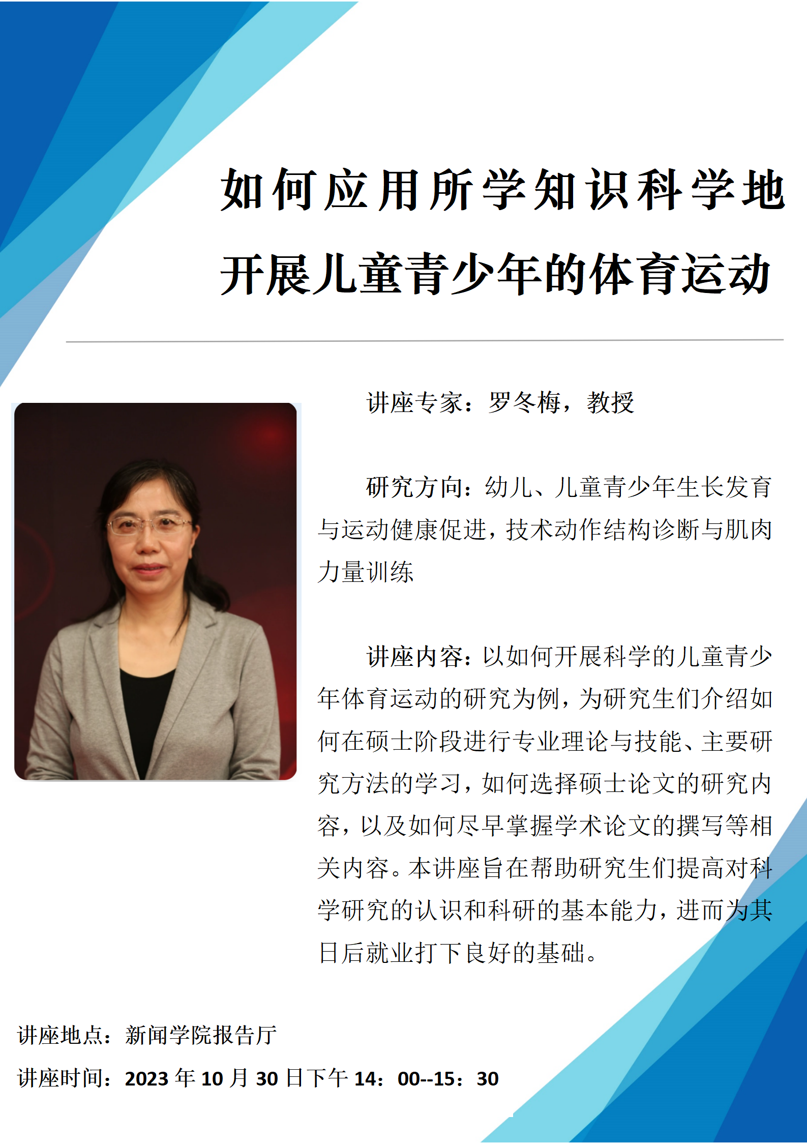 为更好地提升和培养2026世界杯官方合作网站学生的科研素养和实践应用能力,营造良好学习氛围,2026世界杯官方合作网站于2023年10月30日下午14:00--17:30在新闻学院报告厅,举行了题为《如何应用所学知识科学地开展儿童青少年的体育运动》和《传承中华优秀传统文化弘扬中华体育精神》的两场精彩讲座,我院本科生、研究生悉心聆听。