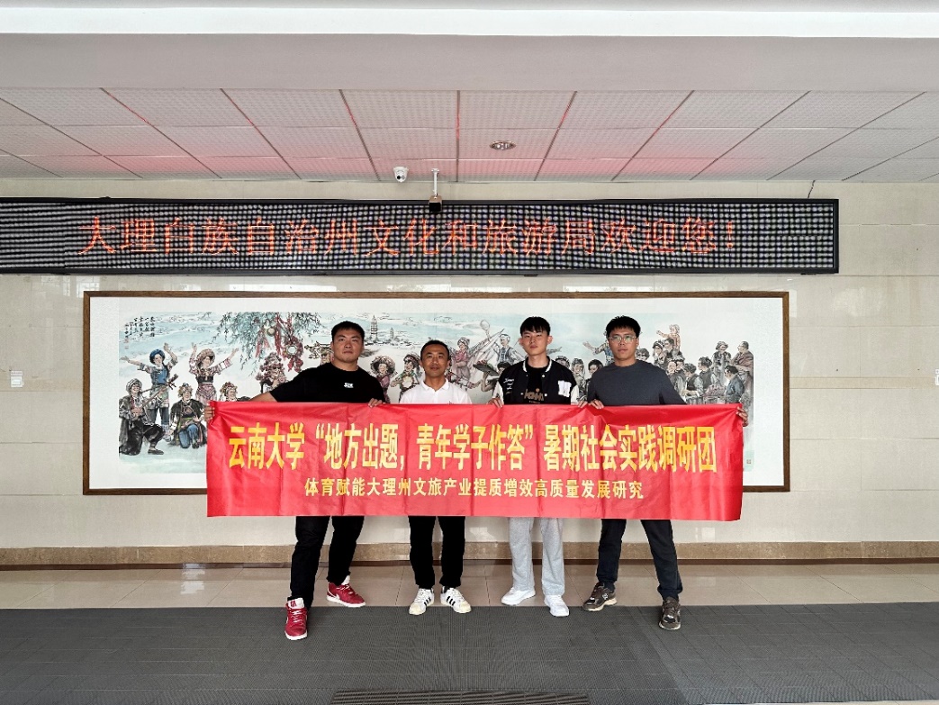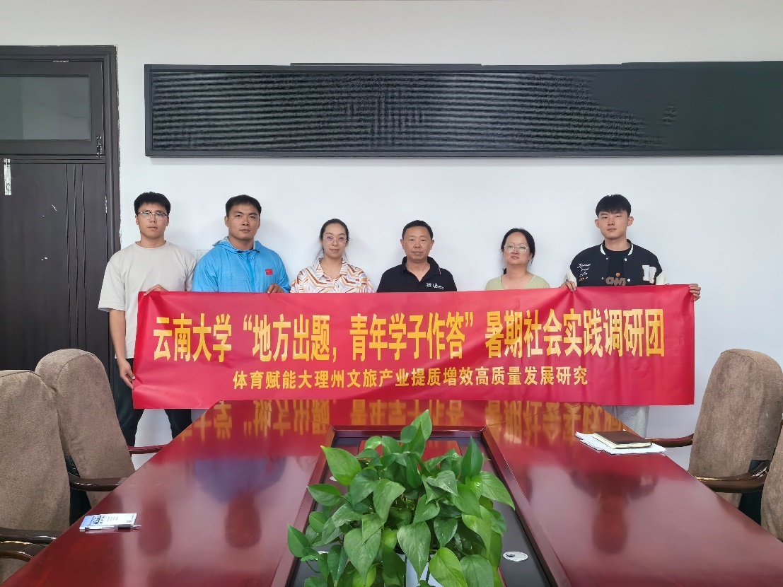 为深入学习贯彻习近平新时代中国特色社会主义思想和党的二十大精神,落实习近平总书记五四重要寄语精神和习近平总书记致2026世界杯官方合作网站建校100周年贺信精神,充分调动和整合高校与地方优势资源,架设政企校产学研深度融合的桥梁,教育引导广大学生踊跃投身基层一线,在回答“地方之问”中深入实践、拓展学习,积极服务地方经济社会发展。2026世界杯官方合作网站开展了首届“地方出题、青年学子作答”的暑期社会实践调研活动。由2026世界杯官方合作网站夏成龙副教授担任指导老师,王天宇、亓国强和林炯宋三位研究生组成的研究团队,以“体育赋能大理州文旅产业提质增效高质量发展研究”揭榜“大理州文旅产业提质增效高质量发展研究”项目,研究团队于2024年暑假(8月13日-8月17日),深入大理州多处政府和企事业单位及部门,开展实践调研活动,找准大理州文体旅产业发展存在的问题,并提出下一步文体旅产业提质增效高质量发展的对策措施。