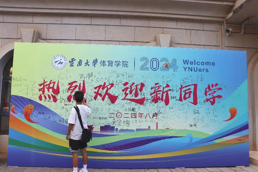 报道现场,迎新志愿者和老师们井然有序地进行新生信息核查登记、材料接受、物品发放,并组织新生在新生签名板上签字拍照留念,相互配合确保迎新工作的顺利开展。