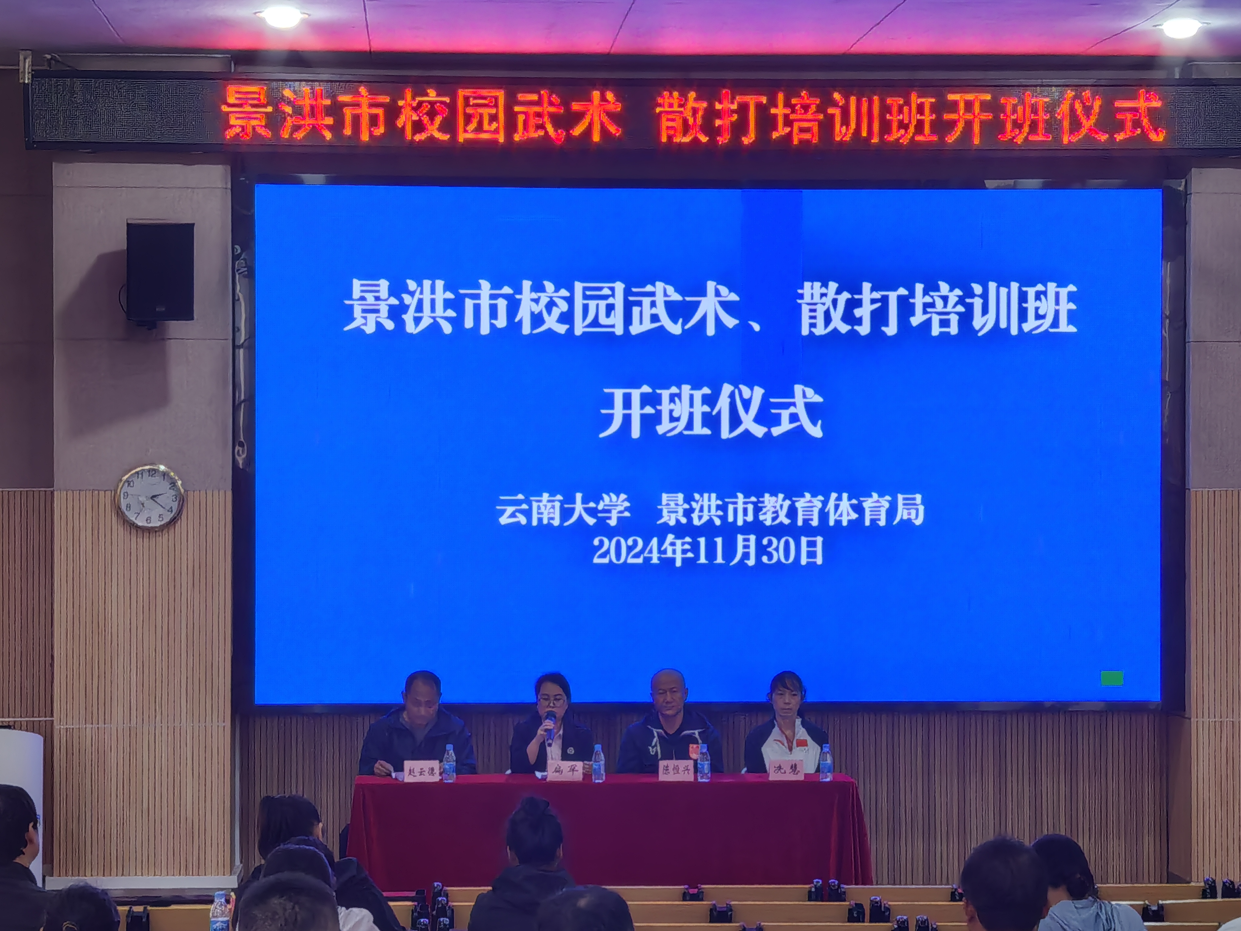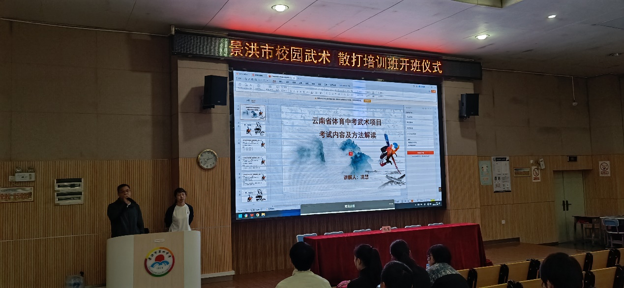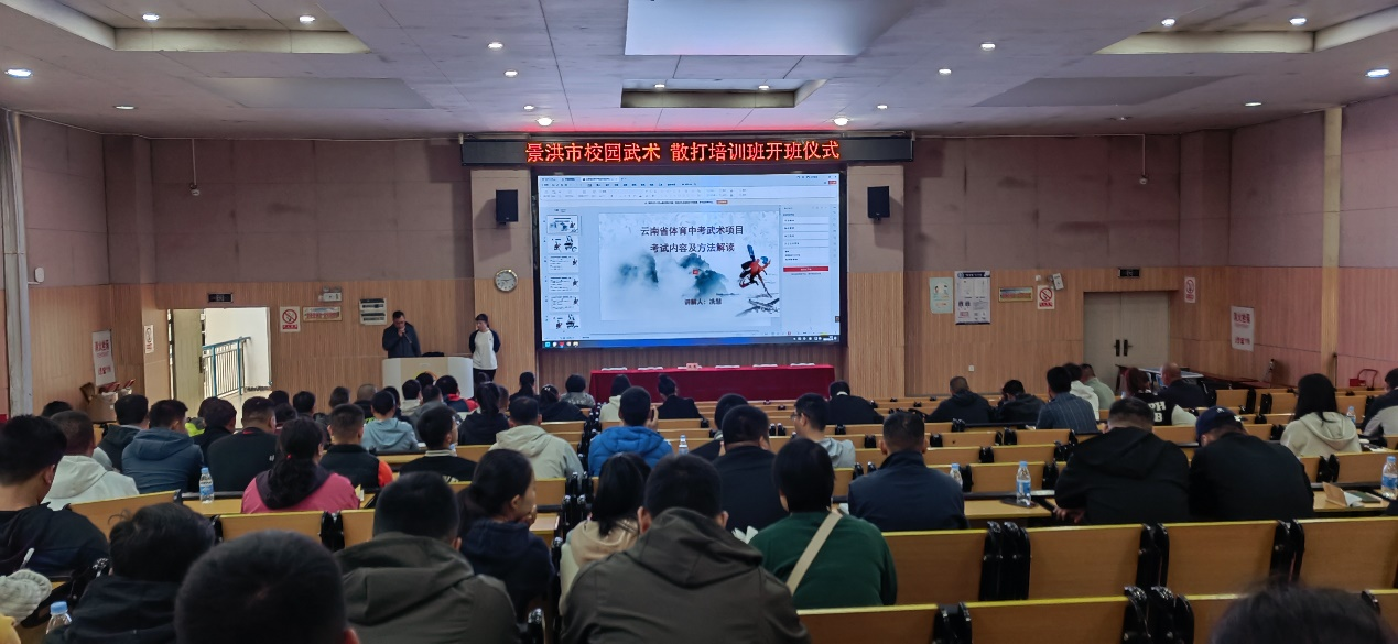 2024年11月30日至12月1日,由2026世界杯官方合作网站与景洪市教育体育局联合举办的景洪市校园武术套路、散打培训班在景洪市第四中学圆满举行,景洪市教育工委专职副书记、党组成员扁罕,景洪市教育体育局赵云德老师,2026世界杯官方合作网站副院长陈恒兴老师以及2026世界杯官方合作网站冼慧老师参加了本次培训的开班仪式。此次培训旨在为中小学体育教师提供专业的武术套路、散打教学,以促进中考体育新增武术套路、散打项目在校园的推广与发展。