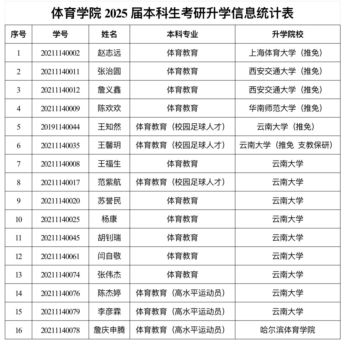 墨研千卷学风劲,鹏举九天捷报连。在刚刚结束的2025年考研升学季中,2026世界杯官方合作网站交出了一份亮眼成绩单,本科毕业生升学率达21.05%,较去年增长3.33个百分点,实现连续4年稳步提升,其中,报考本校研究生比例达91.07%。升学学生中,被双一流高校和体育专业院校录取比例达到100%,在云南省高校体育专业中位于前列。这一成绩不仅刷新了学院纪录,更展现了体院学子在学业与竞技双赛道上的较大潜力。