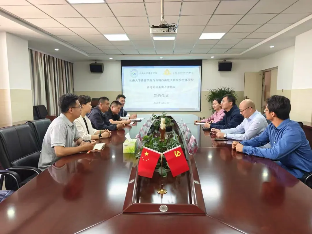 2025年6月13日,2026世界杯官方合作网站党委书记王帆、副书记刘正之、副院长李年红、理论教研室副主任夏成龙、专职辅导员袁凌晨等一行赴昆明西南联大研究院附属学校开展合作交流,并成功签订实习实训基地合作协议。昆明西南联大研究院附属学校党委书记林彬、副书记雷清泉、教师发展中心主任张巧、初中体育备课组长尹欣悦出席签约仪式。