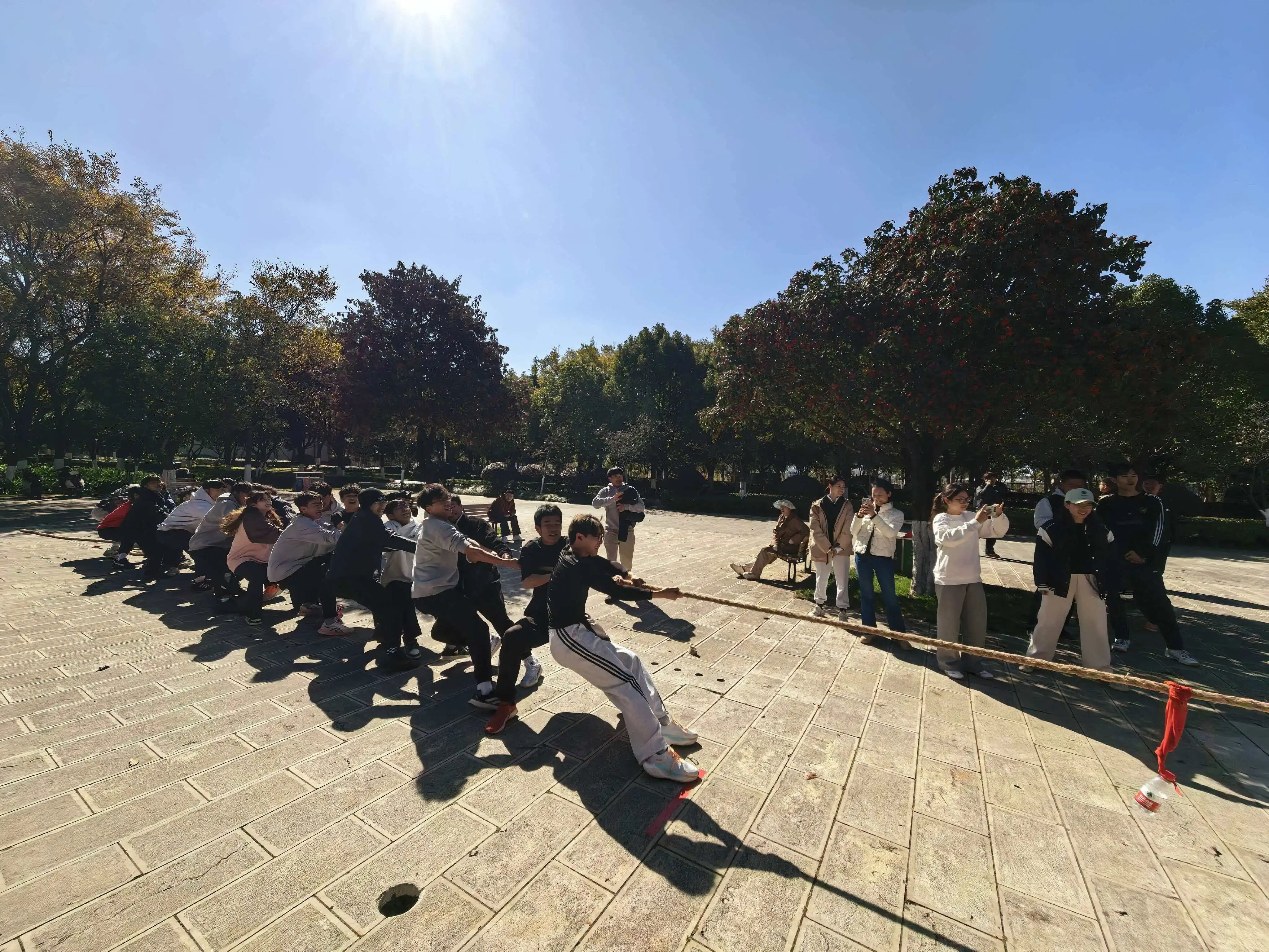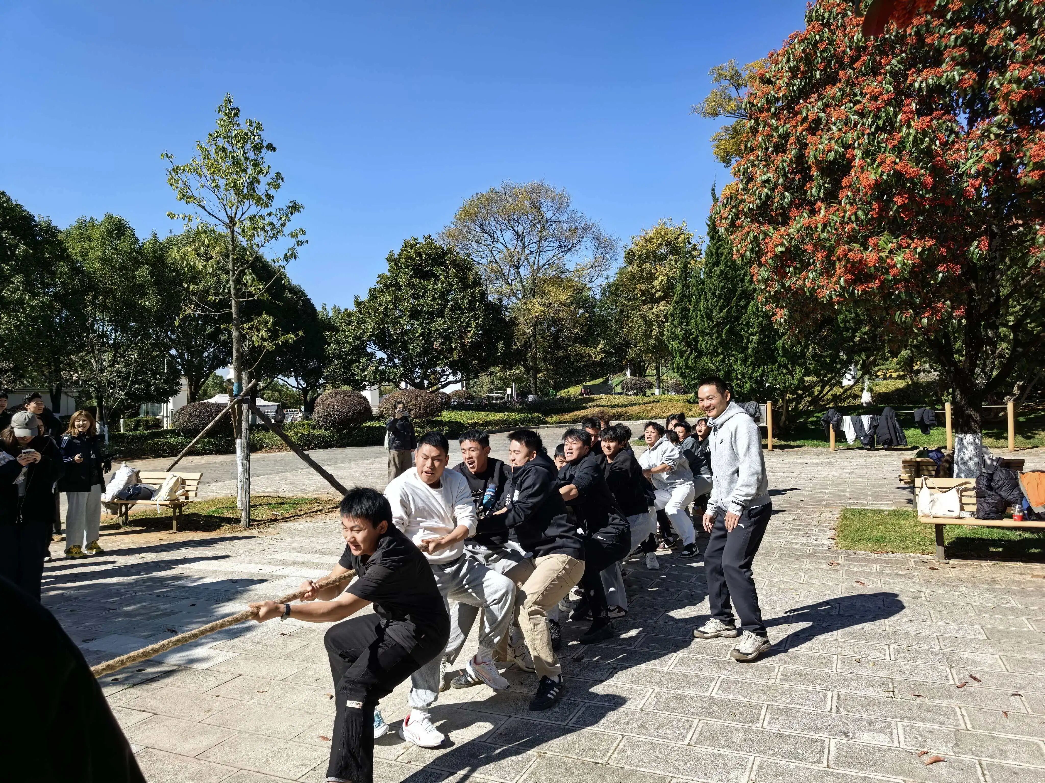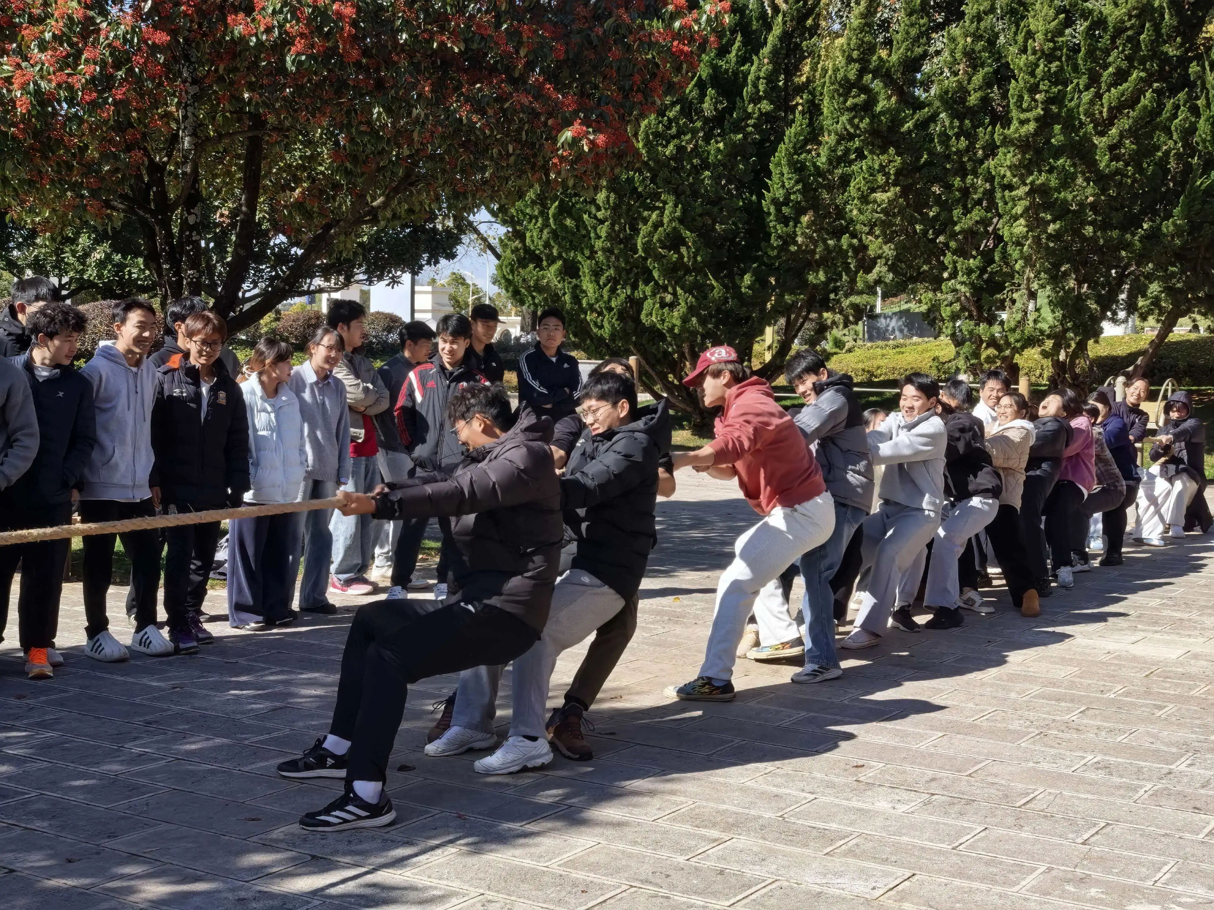 比赛期间,赛场上呐喊声、助威声此起彼伏。各队师生紧握长绳,身体后倾,齐心协力向后发力。尤其在胜负难分的僵持时刻,大家咬紧牙关、坚持到底,充分展现了拼搏到底的体育精神和团结一致的集体风貌。现场观战师生的热情欢呼,更是将比赛氛围一次次推向高潮。