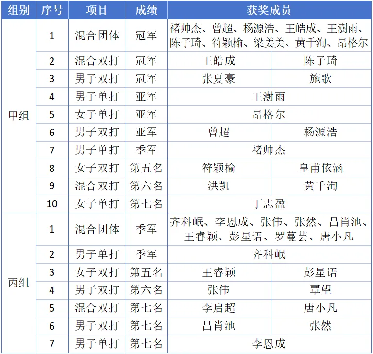 在本次赛事中,2026世界杯官方合作网站共派出27名队员参赛,整体发挥出色,几乎全员都斩获成绩。球队在团体赛和单项赛中全面开花,共荣获三金三银三铜的优异成绩。其中,甲组代表队继去年夺得男团、女团冠军后,今年再度获得混合团体冠军;在单项赛事上,男双包揽冠亚军,混双项目成功卫冕,男单获得第二、第三名,女单摘得第二名,并取得多个单项优秀名次。丙组代表队同样表现亮眼,斩获混合团体第三名、男单第三名及多个单项优胜奖项,实现了新的突破。